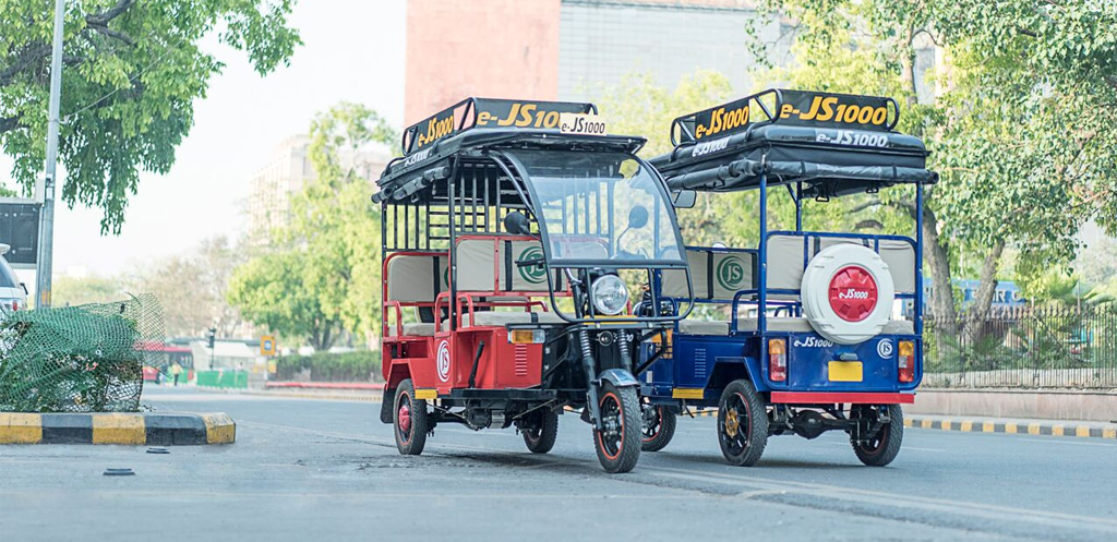 “e-JS1000” is a three wheeled vehicle which is solely driven by an electric motor and backed by four lead acid batteries. It has a capacity to carry 4+1 (driver) passengers with an additional load of 40 kg. It has become a replacement to the auto rickshaw in many cities due to its cost efficiency and efficacy in mobilizing the common man.